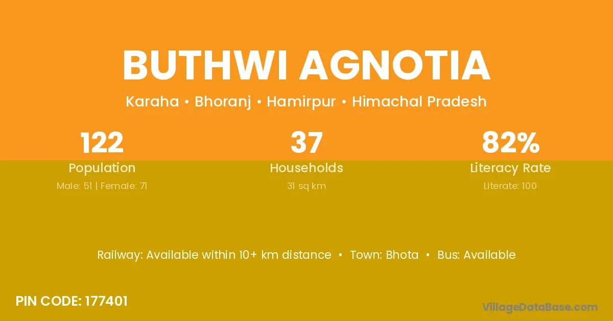 Buthwi Agnotia village has a total population of 122 people, of which 51 are males and 71 are females.