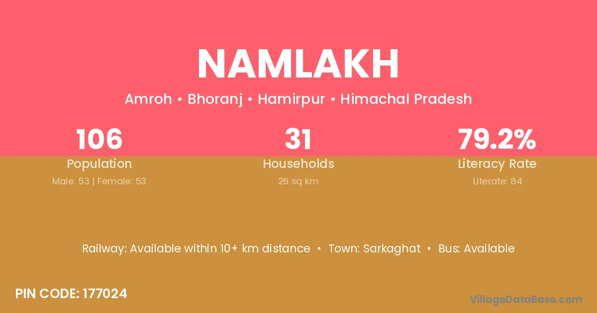 Namlakh village has a total population of 106 people, of which 53 are males and 53 are females.