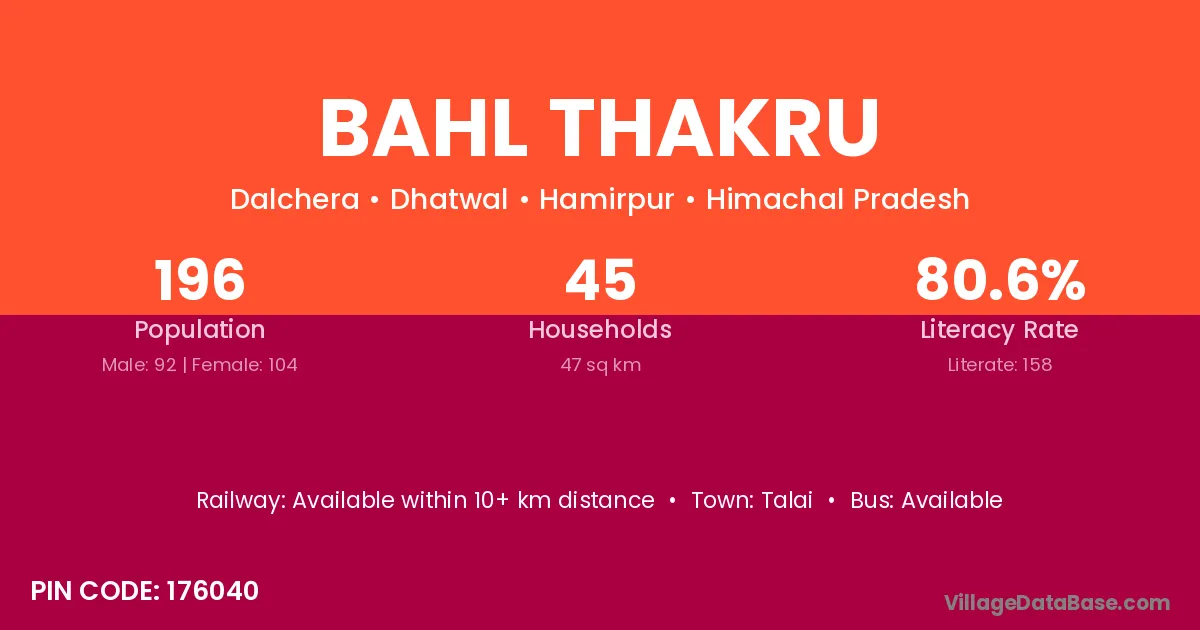 Bahl Thakru village has a total population of 196 people, of which 92 are males and 104 are females.