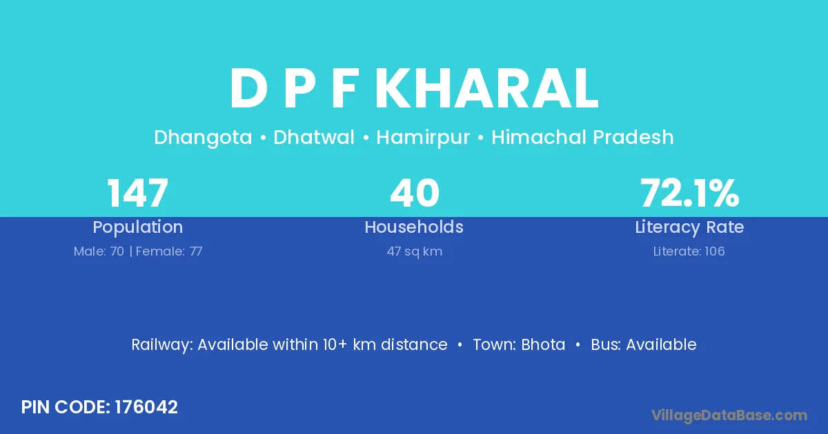 D P F Kharal village has a total population of 147 people, of which 70 are males and 77 are females.