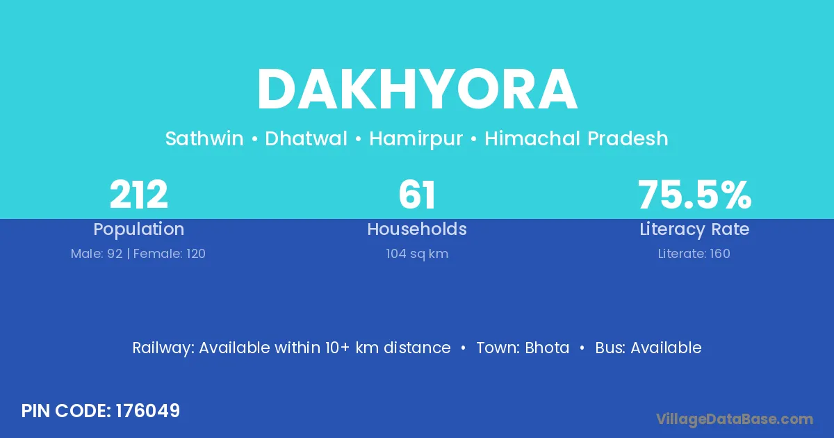 Dakhyora village has a total population of 212 people, of which 92 are males and 120 are females.