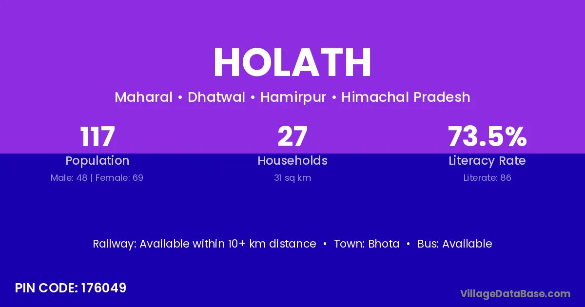 The literacy rate of Holath village is 73.50%. Male literacy stands at 77.08% and female literacy at 71.01%.