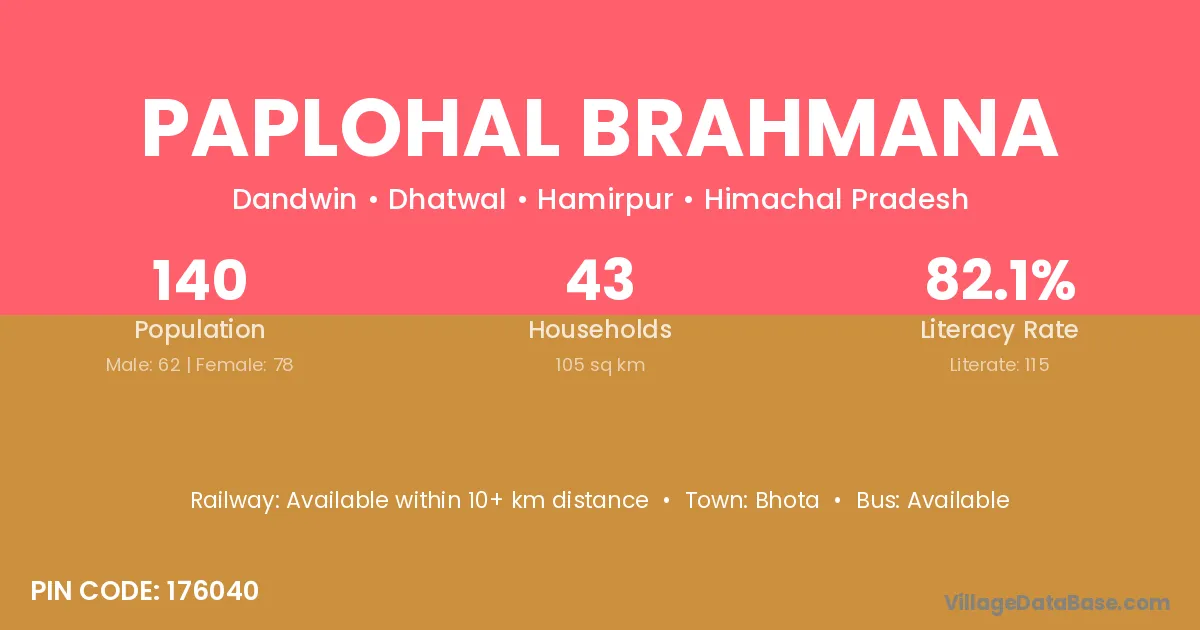 Paplohal Brahmana village has a total population of 140 people, of which 62 are males and 78 are females.
