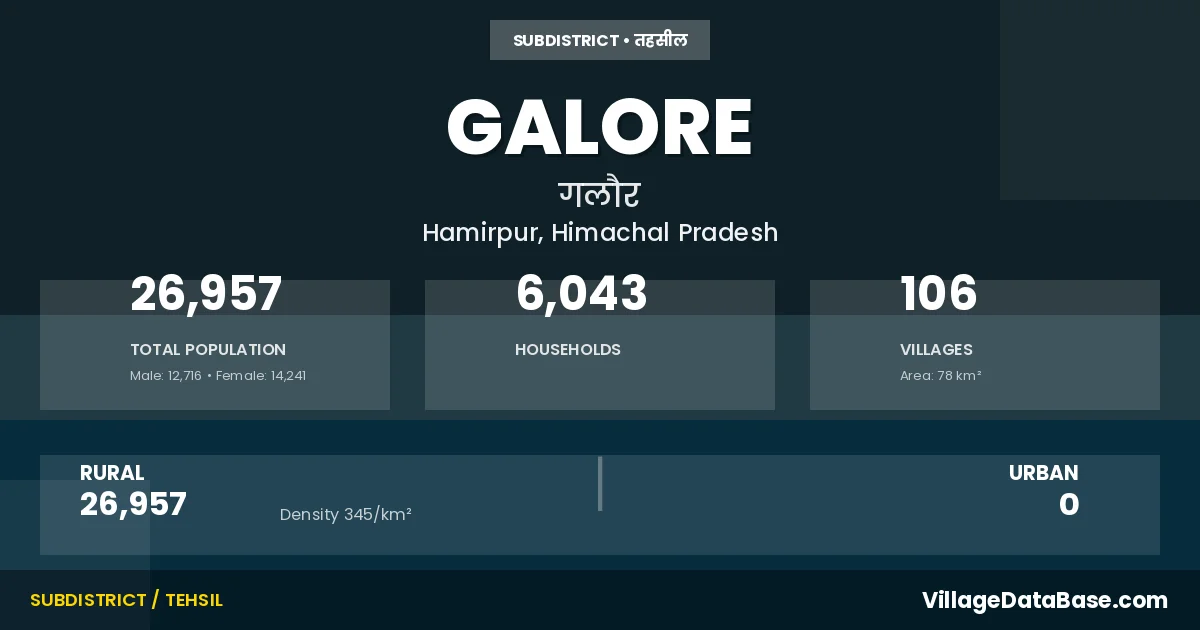 Galore is a town and Tehsil in the Hamirpur district of the Himachal Pradesh. In India, a Tehsil is a subdivision of a district responsible for the administration and revenue collection of a specific area within the district. Tehsils play a crucial role in the local governance structure, contributing significantly to the development and administration of their communities.