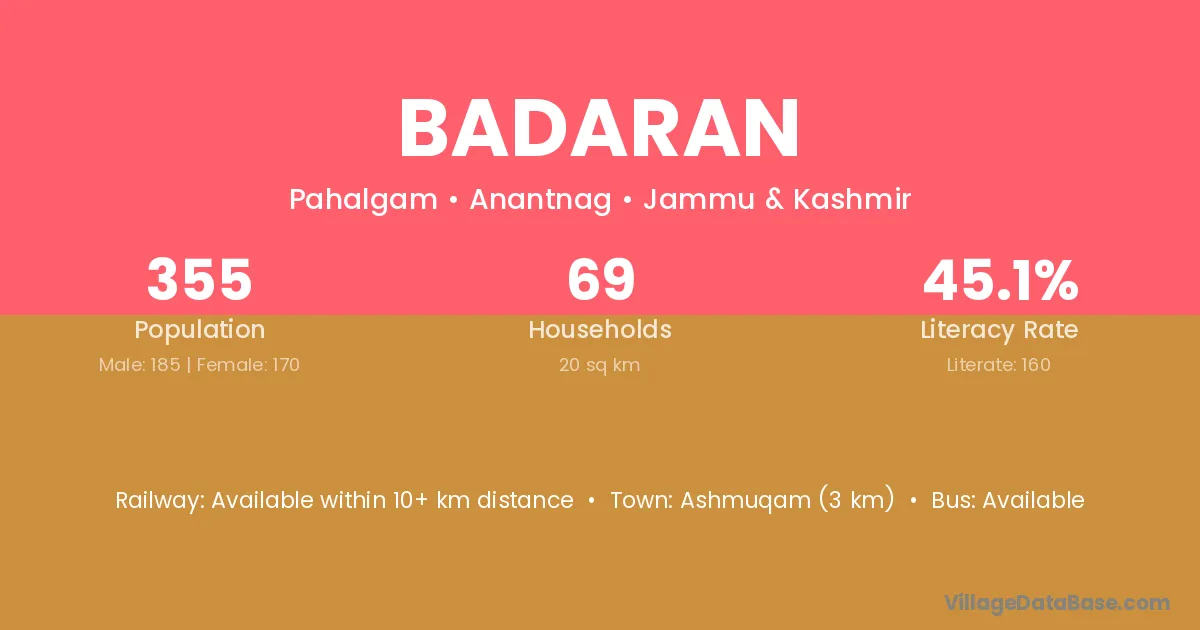 Badaran village has a total population of 214 people, of which 92 are males and 122 are females.