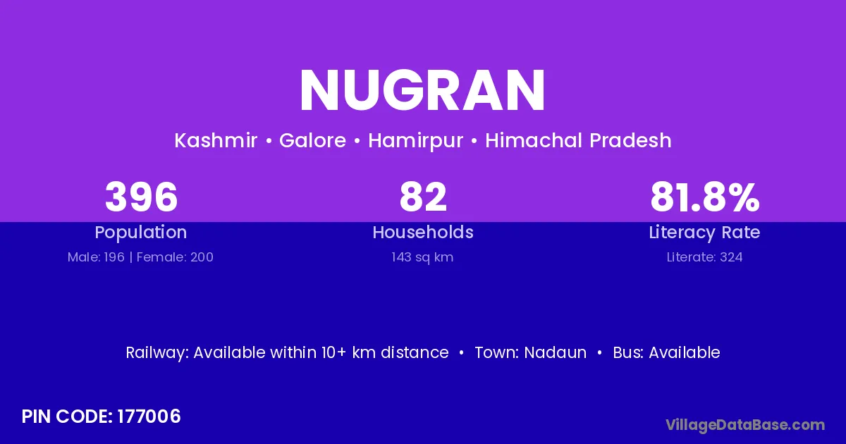 Nugran village has a total population of 396 people, of which 196 are males and 200 are females.