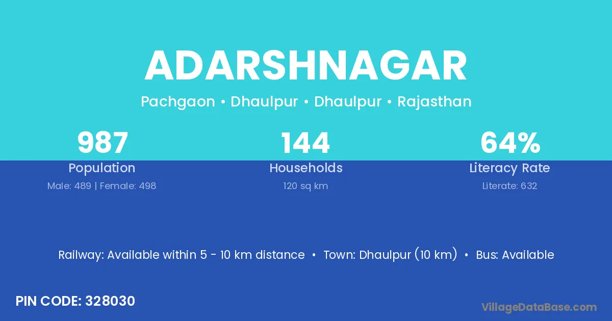 The literacy rate of Adarshnagar village is 78.63%. Male literacy stands at 79.59% and female literacy at 77.94%.