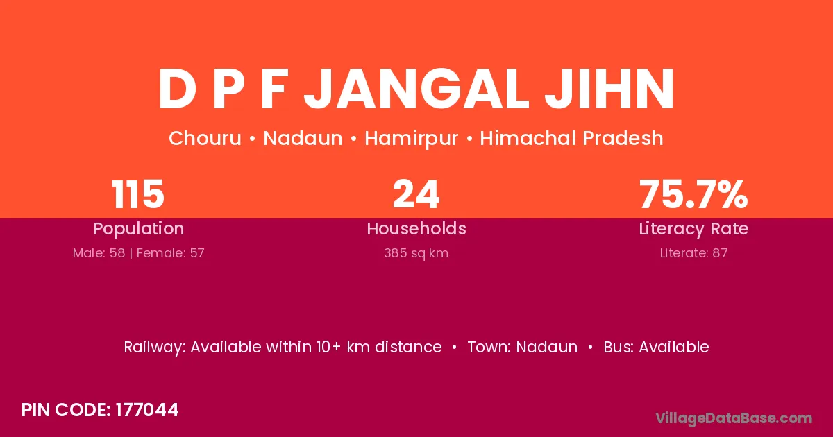 D P F Jangal Jihn village has a total population of 115 people, of which 58 are males and 57 are females.