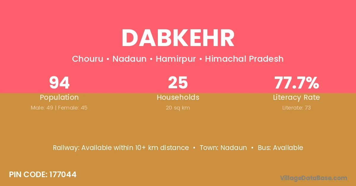 Dabkehr village has a total population of 94 people, of which 49 are males and 45 are females.