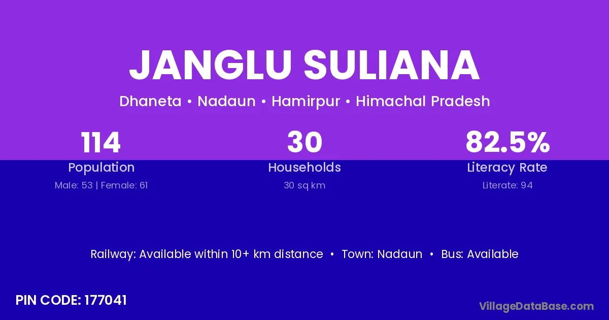 Janglu Suliana village has a total population of 114 people, of which 53 are males and 61 are females.