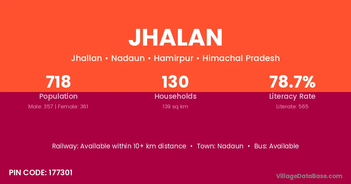 Jhalan village has a total population of 718 people, of which 357 are males and 361 are females.
