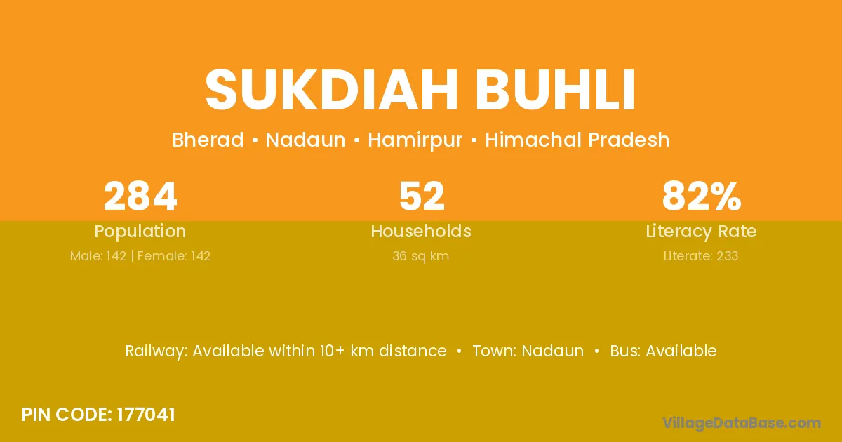 Sukdiah Buhli village has a total population of 284 people, of which 142 are males and 142 are females.