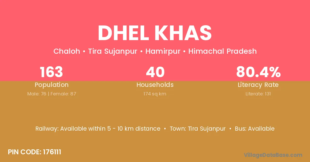 Dhel Khas village has a total population of 163 people, of which 76 are males and 87 are females.