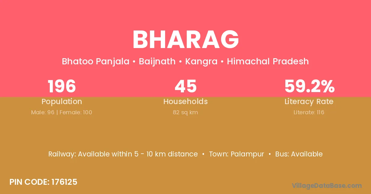 Bharag village has a total population of 196 people, of which 96 are males and 100 are females.