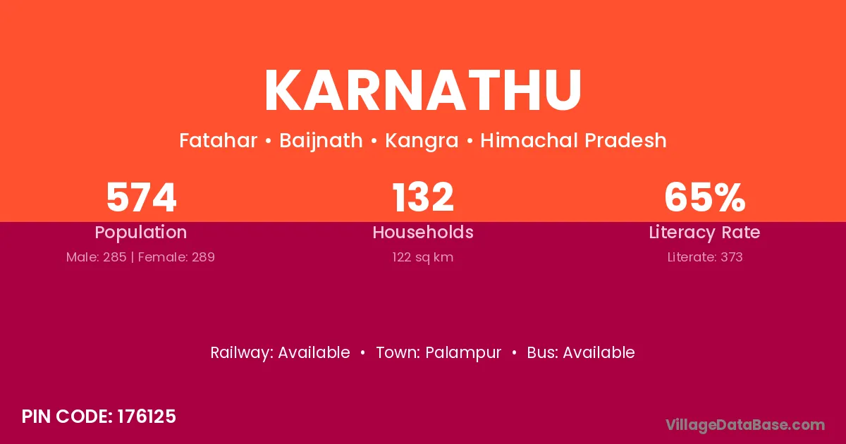 Karnathu village has a total population of 574 people, of which 285 are males and 289 are females.