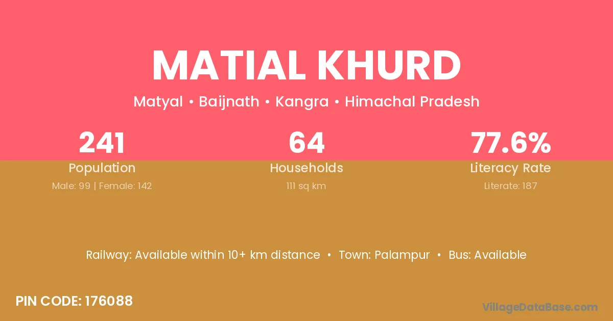 Palampur is the nearest town to Matial Khurd village for major economic activities