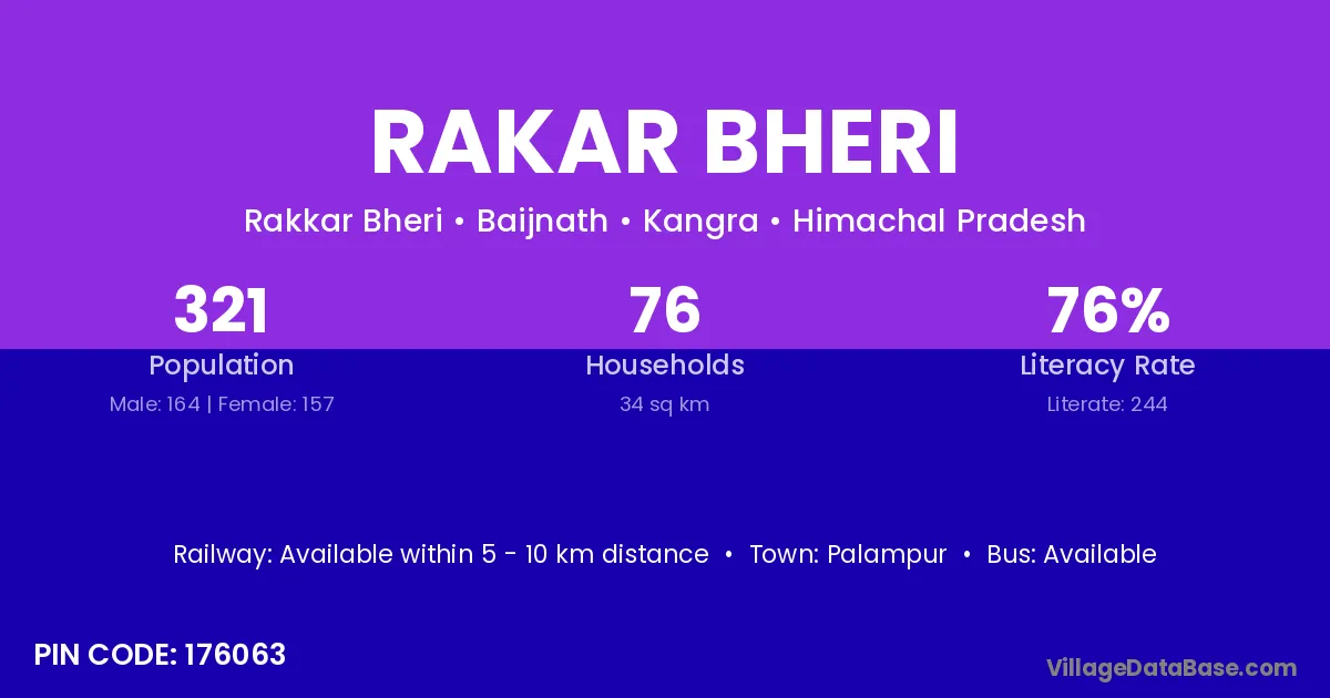 Palampur is the nearest town to Rakar Bheri village for major economic activities