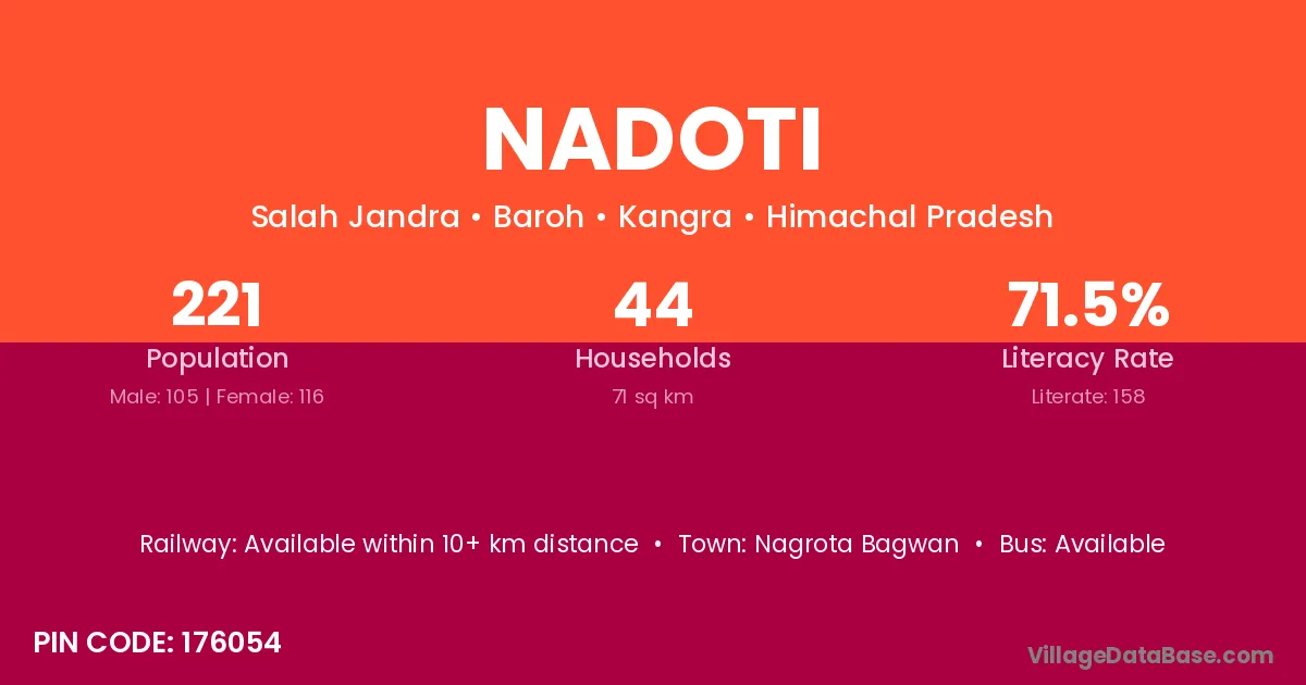 Nadoti village has a total population of 221 people, of which 105 are males and 116 are females.