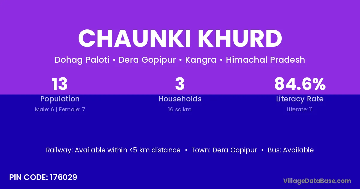 Chaunki Khurd village has a total population of 13 people, of which 6 are males and 7 are females.