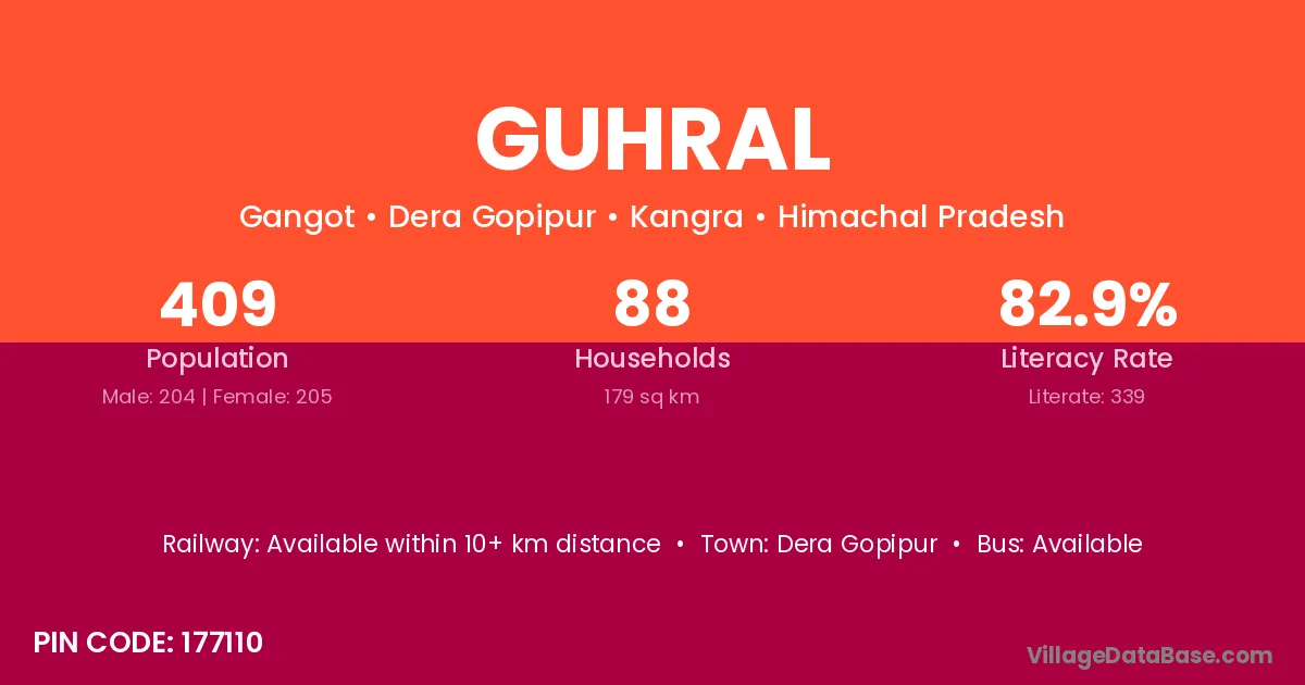 Guhral village has a total population of 409 people, of which 204 are males and 205 are females.