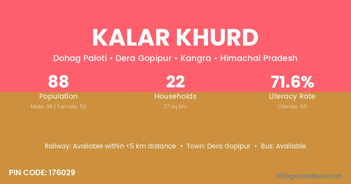 Kalar Khurd village has a total population of 88 people, of which 38 are males and 50 are females.