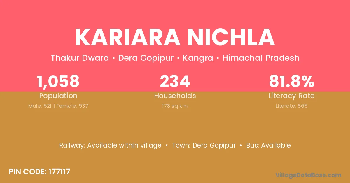 Kariara Nichla village has a total population of 1,058 people, of which 521 are males and 537 are females.