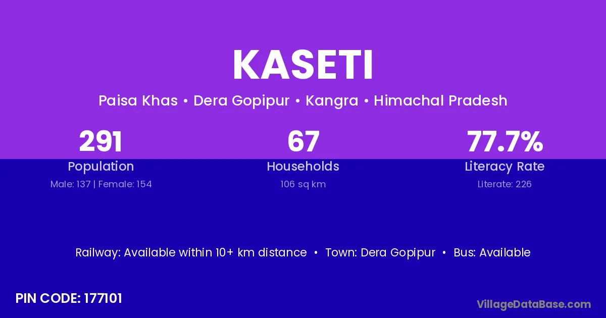 Kaseti village has a total population of 291 people, of which 137 are males and 154 are females.