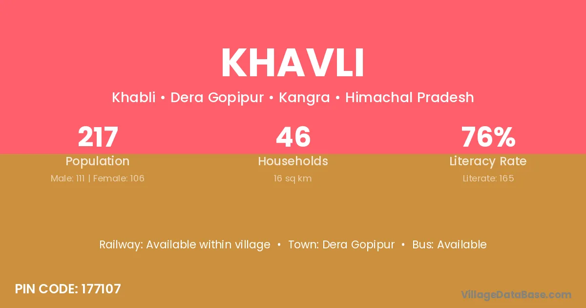 Khavli village has a total population of 217 people, of which 111 are males and 106 are females.