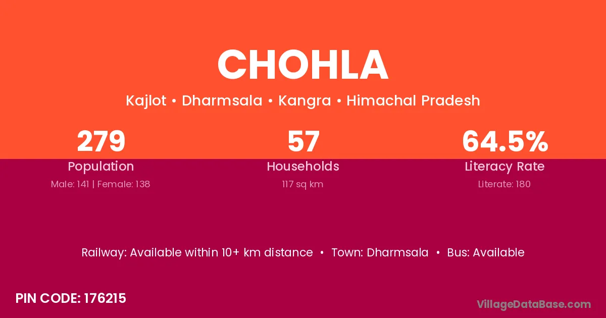 Dharmsala is the nearest town to Chohla village for major economic activities