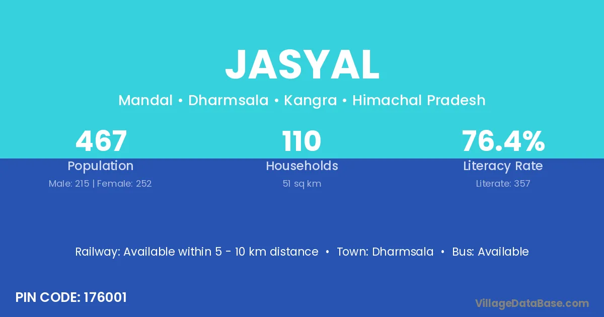 Jasyal village has a total population of 467 people, of which 215 are males and 252 are females.