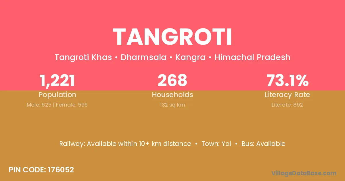 Tangroti village has a total population of 1,221 people, of which 625 are males and 596 are females.