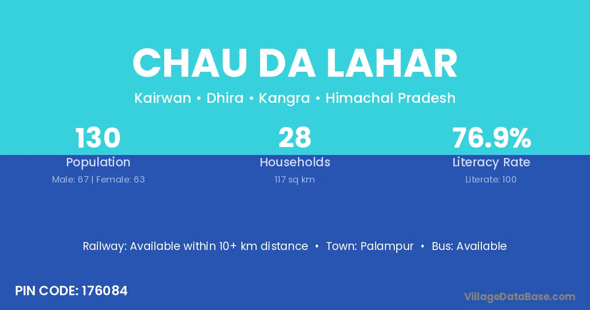 Palampur is the nearest town to Chau Da Lahar village for major economic activities