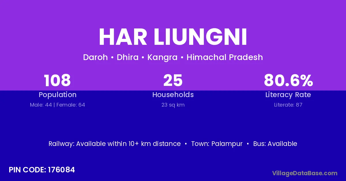 Har Liungni village has a total population of 108 people, of which 44 are males and 64 are females.