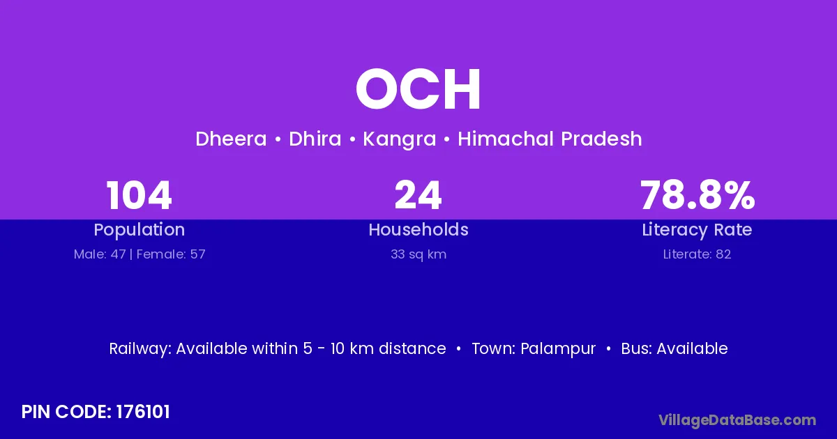 The literacy rate of Och village is 78.85%. Male literacy stands at 80.85% and female literacy at 77.19%.