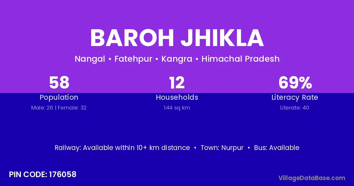 Baroh Jhikla village has a total population of 58 people, of which 26 are males and 32 are females.