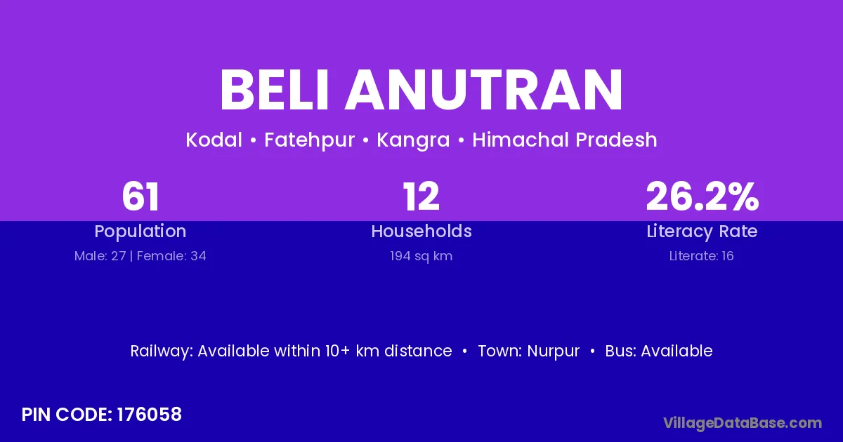 Beli Anutran village has a total population of 61 people, of which 27 are males and 34 are females.
