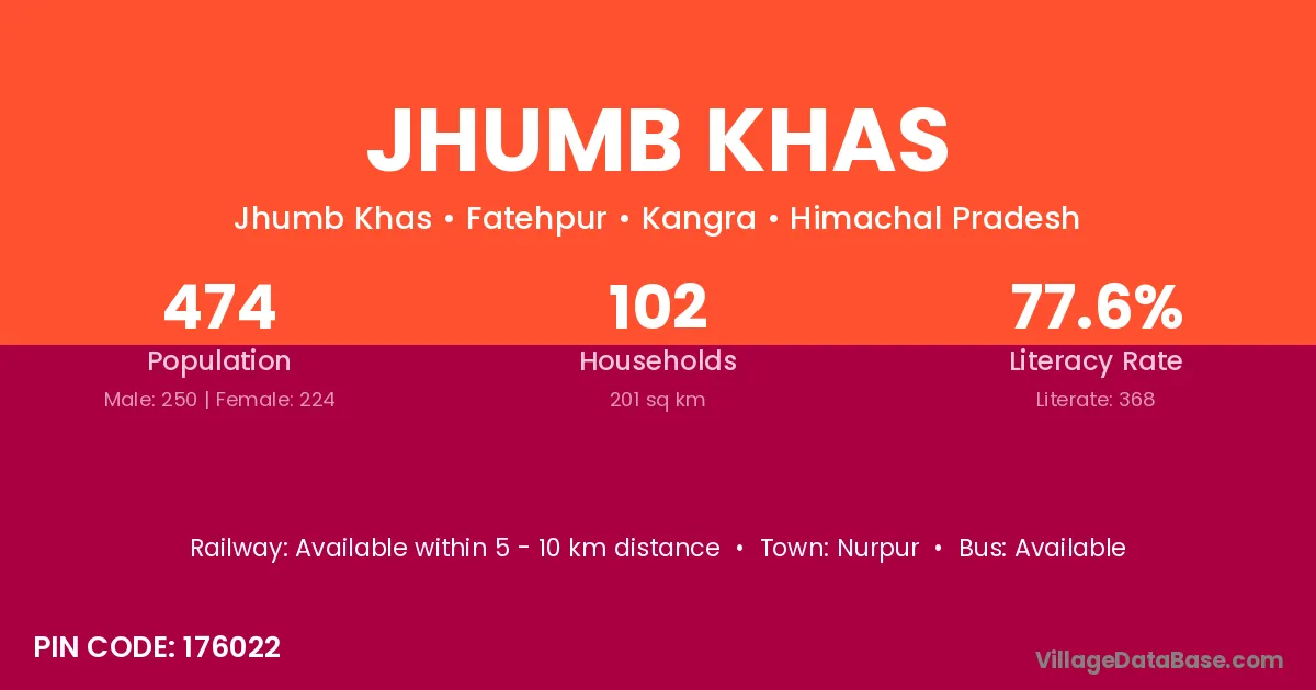 Jhumb Khas village has a total population of 474 people, of which 250 are males and 224 are females.