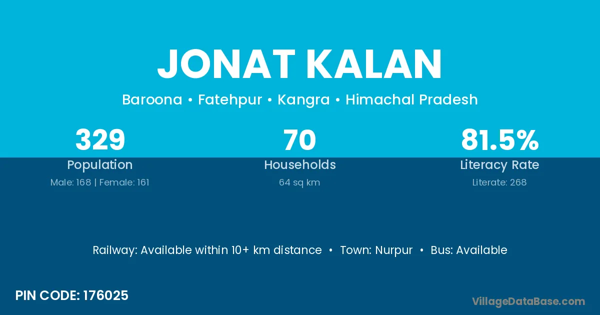 Jonat Kalan village has a total population of 329 people, of which 168 are males and 161 are females.