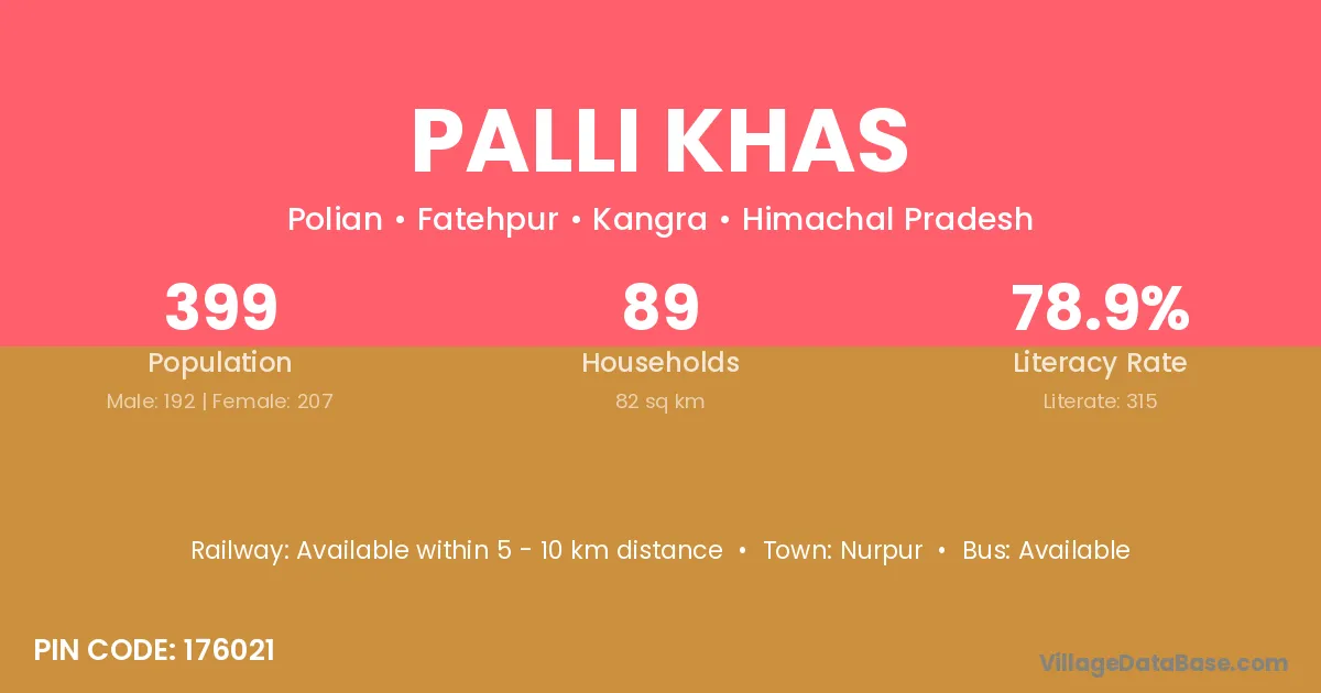 Palli Khas village has a total population of 399 people, of which 192 are males and 207 are females.