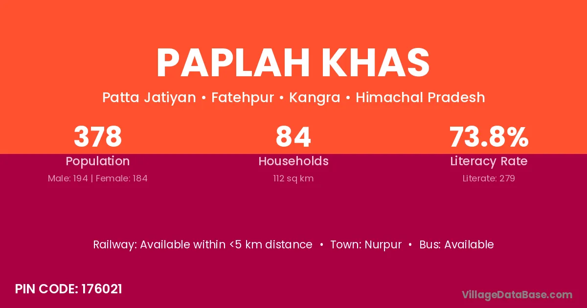 Paplah Khas village has a total population of 378 people, of which 194 are males and 184 are females.