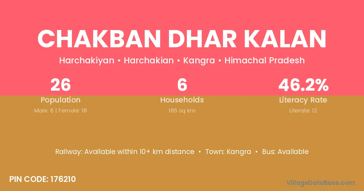 Chakban Dhar Kalan village has a total population of 26 people, of which 8 are males and 18 are females.