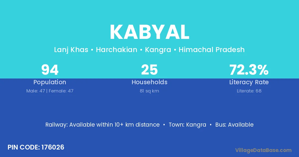 Kabyal village has a total population of 94 people, of which 47 are males and 47 are females.