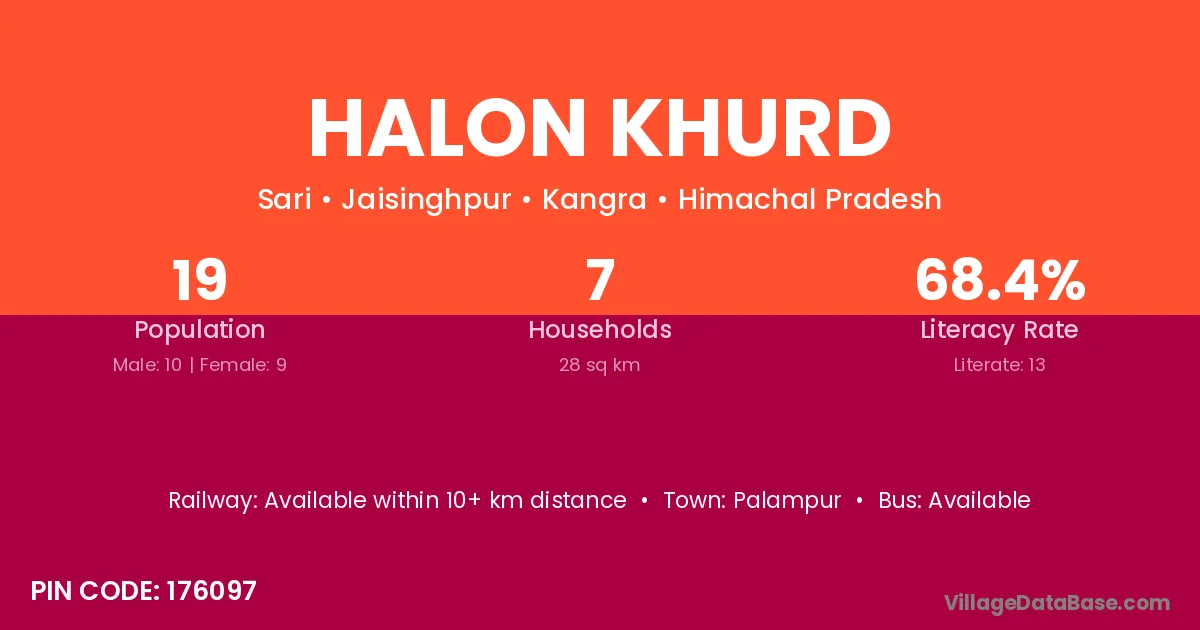Halon Khurd village has a total population of 19 people, of which 10 are males and 9 are females.