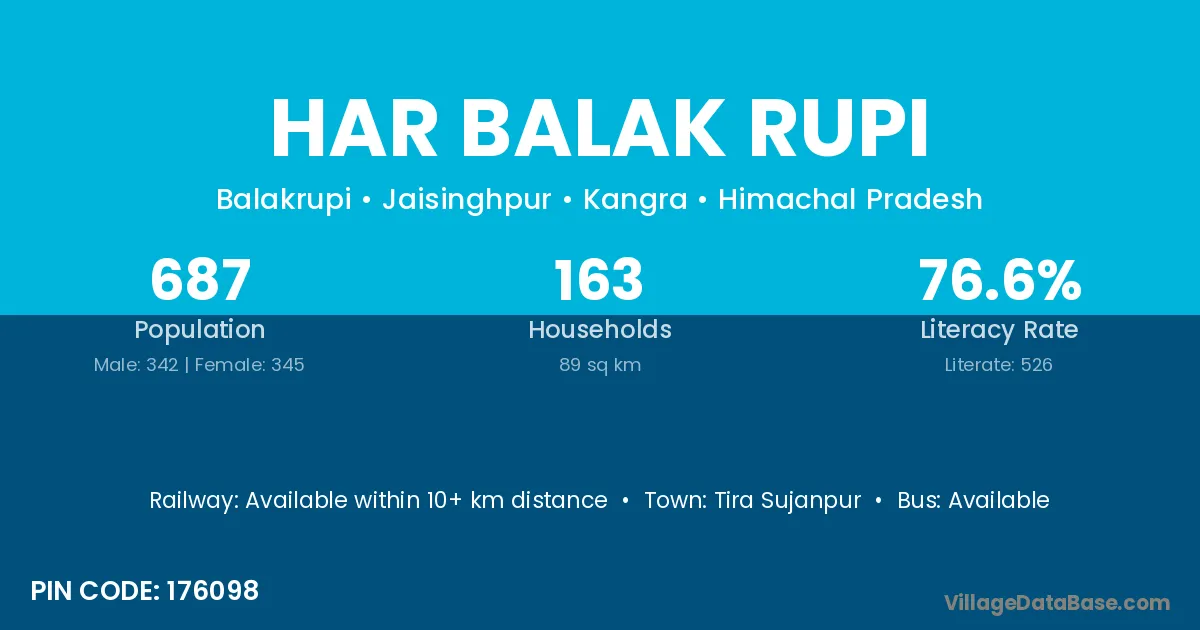 Har Balak Rupi village has a total population of 687 people, of which 342 are males and 345 are females.