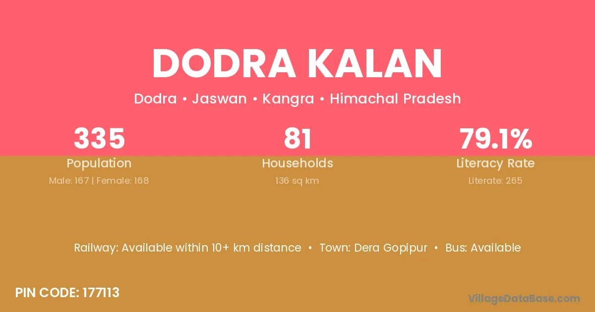 Dodra Kalan village has a total population of 335 people, of which 167 are males and 168 are females.