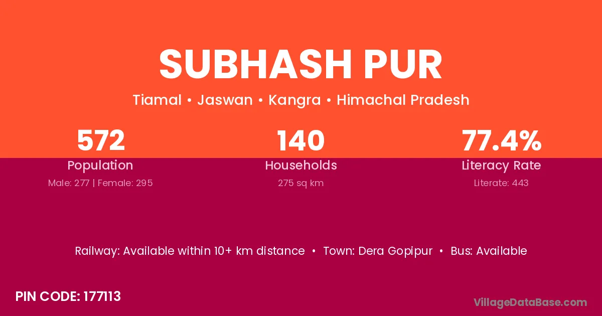 Subhash Pur village has a total population of 572 people, of which 277 are males and 295 are females.