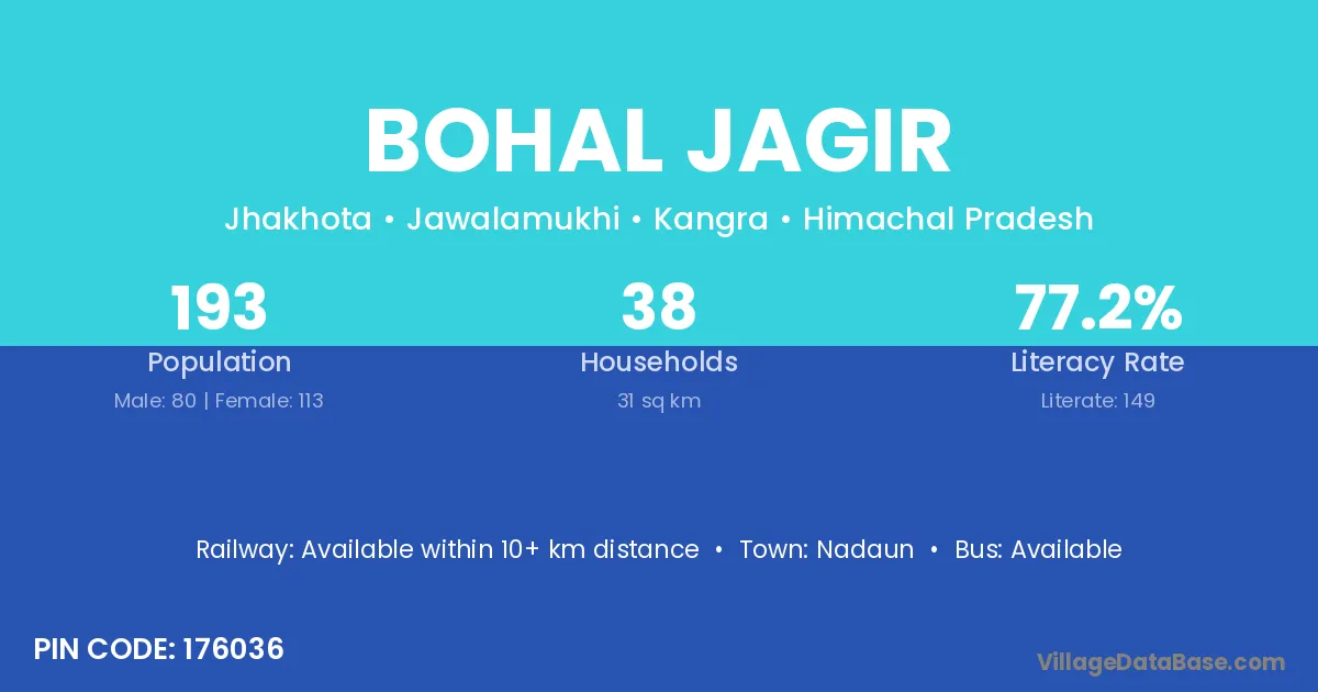 Bohal Jagir village has a total population of 193 people, of which 80 are males and 113 are females.
