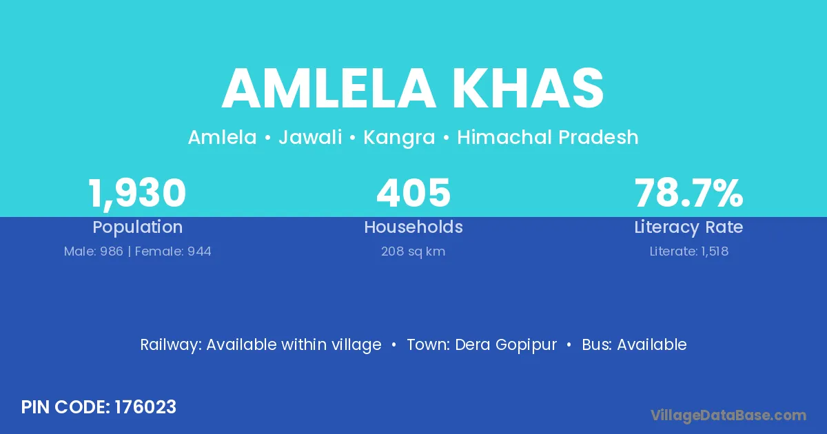 Amlela Khas village has a total population of 1,930 people, of which 986 are males and 944 are females.