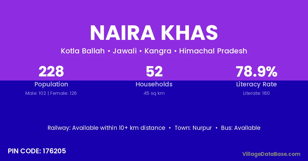 Naira Khas village has a total population of 228 people, of which 102 are males and 126 are females.