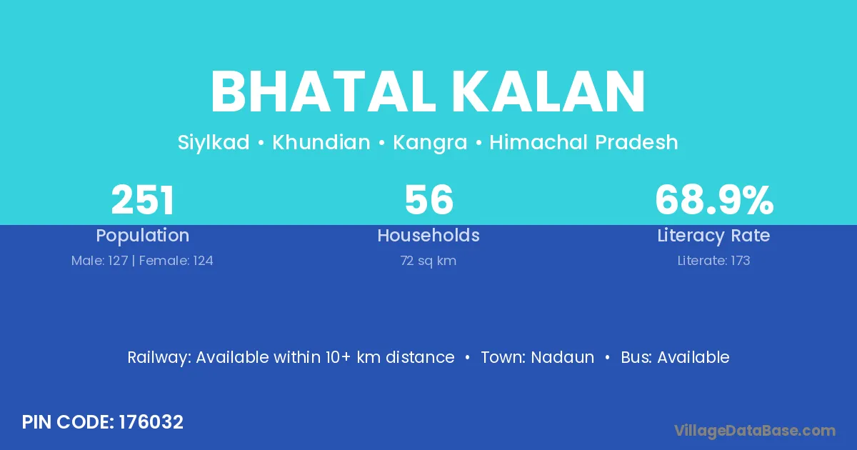 Bhatal Kalan village has a total population of 251 people, of which 127 are males and 124 are females.